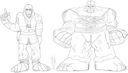 The most common type for Males is the Broadback type; huge, broad hulking humanoids with thick bones and muscles, they are the strongest of the Golian species. Their biological cousins, the Roundbacks are built like a Broadback-sized Sumo-Wrestler, they're arguably the toughest of their species. Not too uncommon are the Longstriders, tall but well-built giants that are considered to be the most agile of their species. Occasionally a cross between a Longstrider and Broadback comes along called a Broadstrider, large-bodied but balanced in terms of strength, endurance and agility.